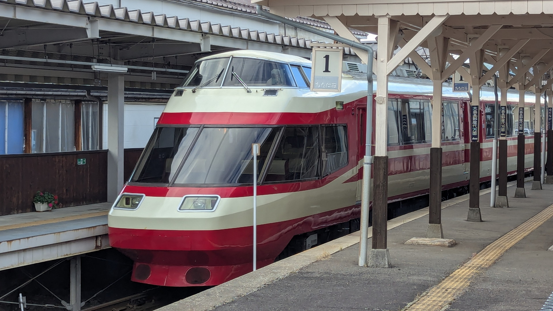 ものすごく見たことがある列車ですが、小田急ロマンスカー10000形を長野電鉄が譲り受けて運行しているそうです。
