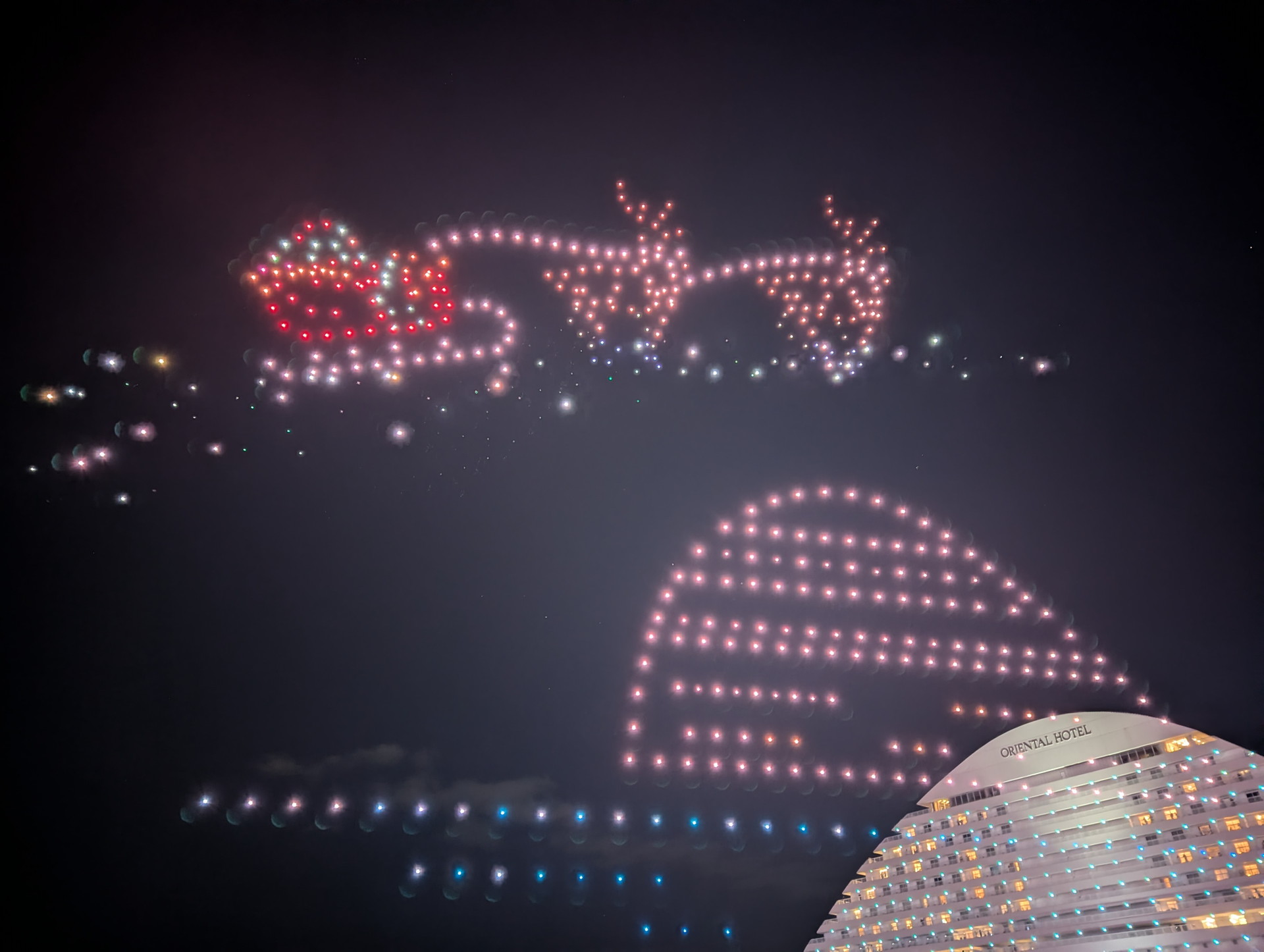 この写真の右下に写っているオリエンタルホテル見ながら空を飛ぶサンタ