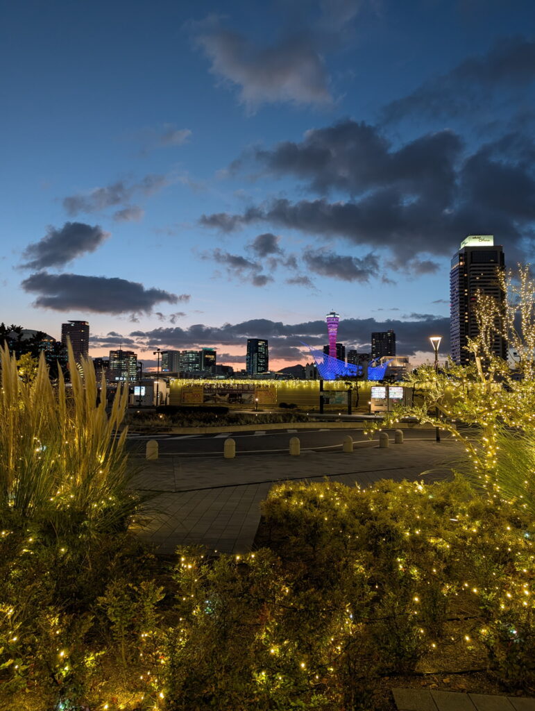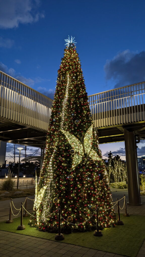 ツリーも輝いて、奥にはメリケンパークが青色でライトアップされています。