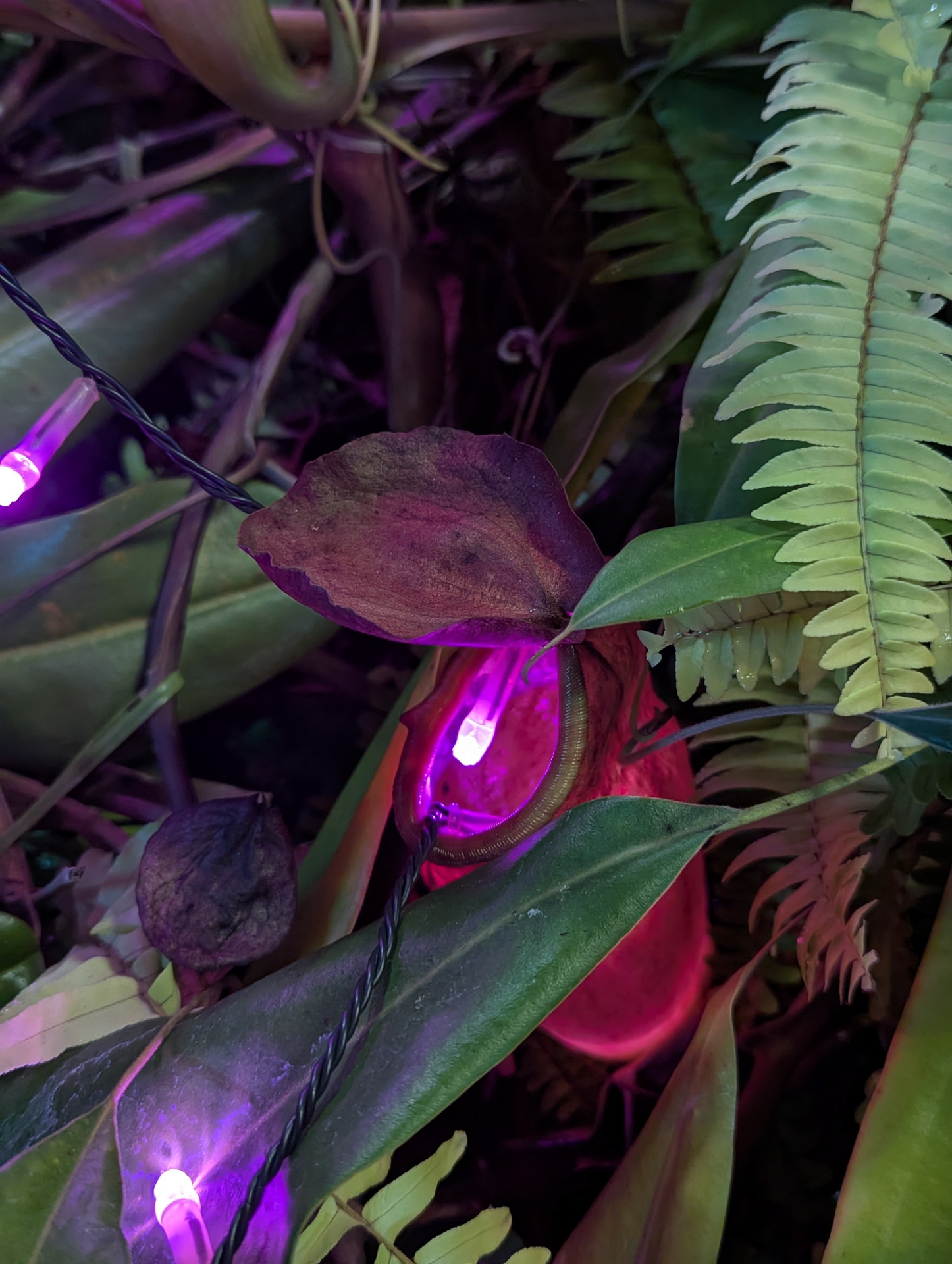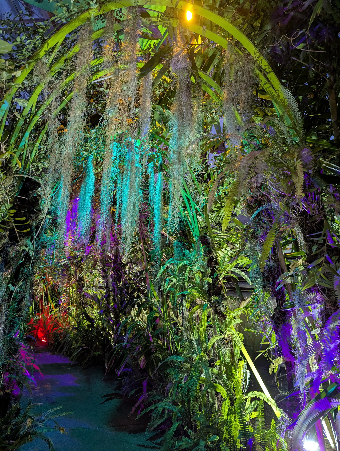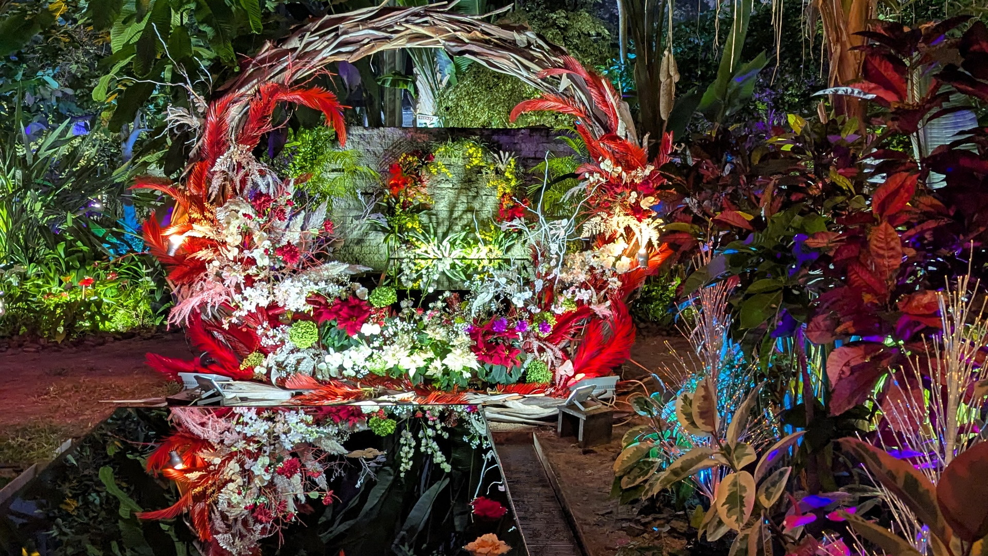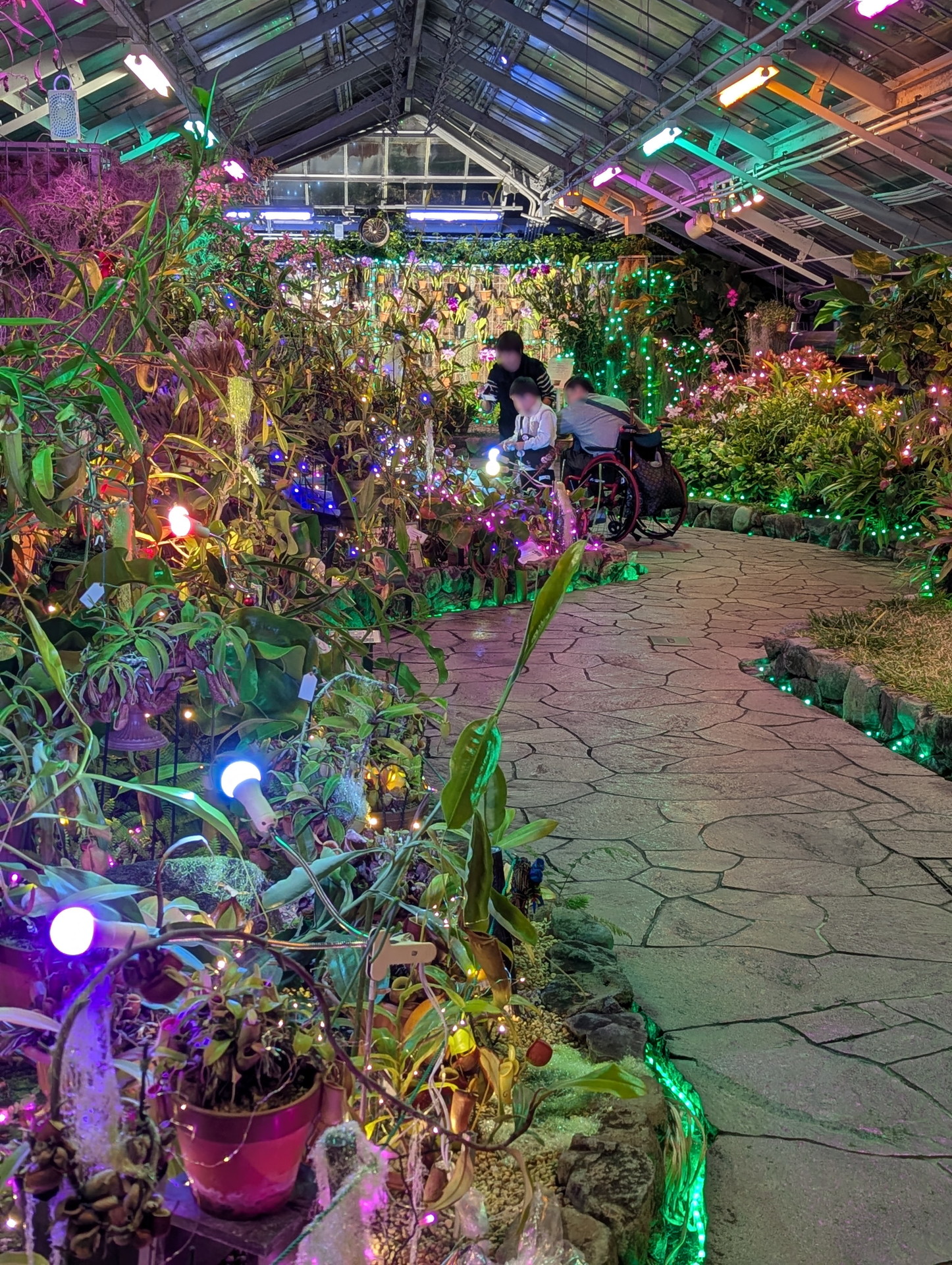 「大温室」エリアでは熱帯植物を鑑賞することができて、特に天井から吊り下げられた無数のベゴニアが咲き乱れる様子は圧巻です。また、世界的に有名な「ウツボカズラ」のコレクションなどが有名なのですが、ライトアップされてどんな雰囲気になっているのでしょうか。