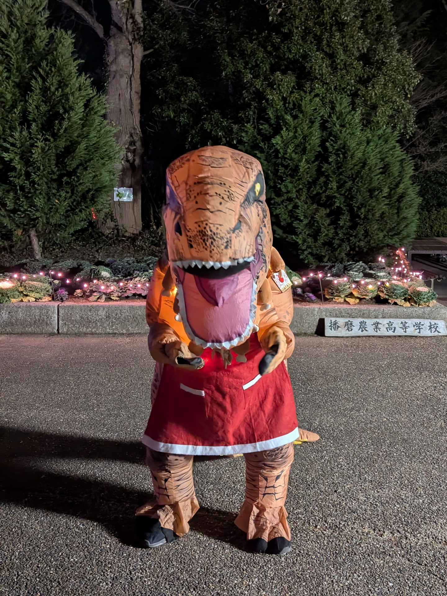 駐車場に戻る途中、フラワーセンターのゲート前でティラノサウルスを発見!
