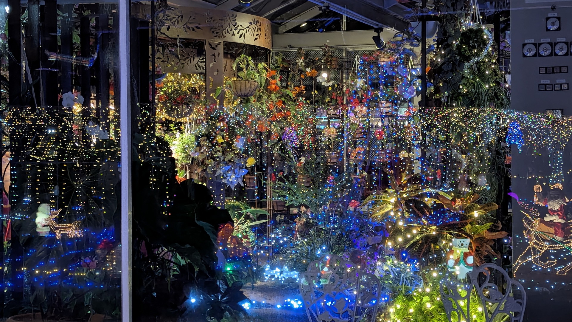 そして、その窓ガラスに中央花壇のライトアップが反射しています。