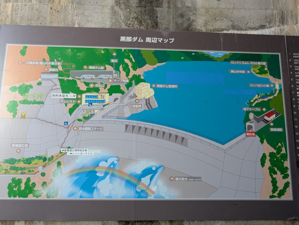 左上の方にある「黒部ダム駅」からダムの堰堤を歩いて現在地のところまで来ました。
