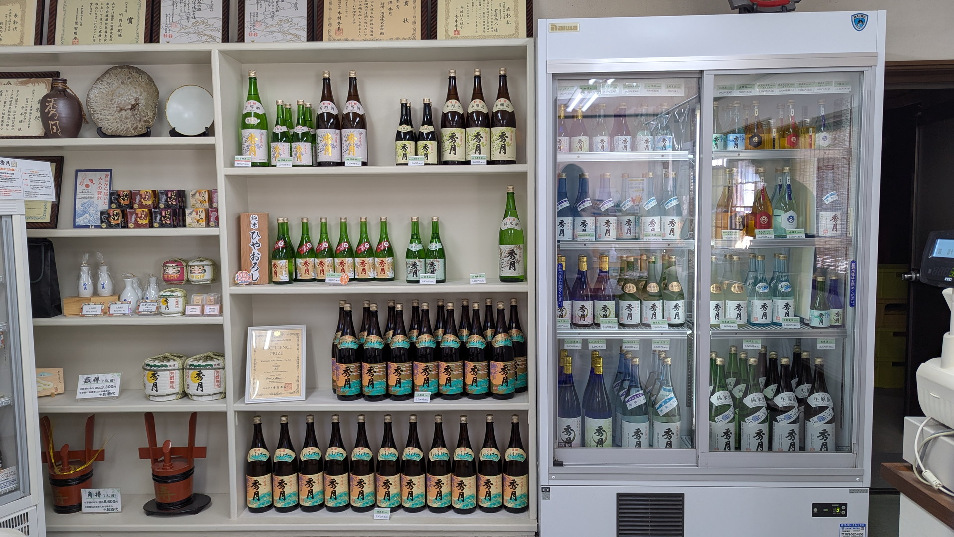 棚には火入れされたお酒、冷蔵庫には生酒がたくさん並んでいます。