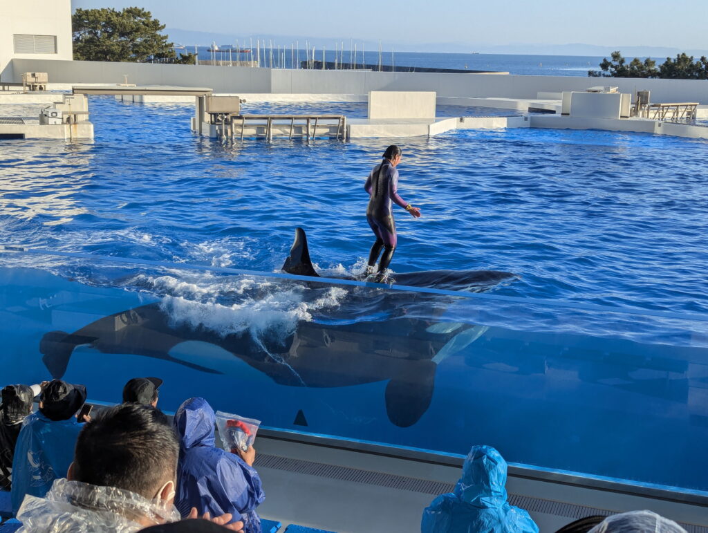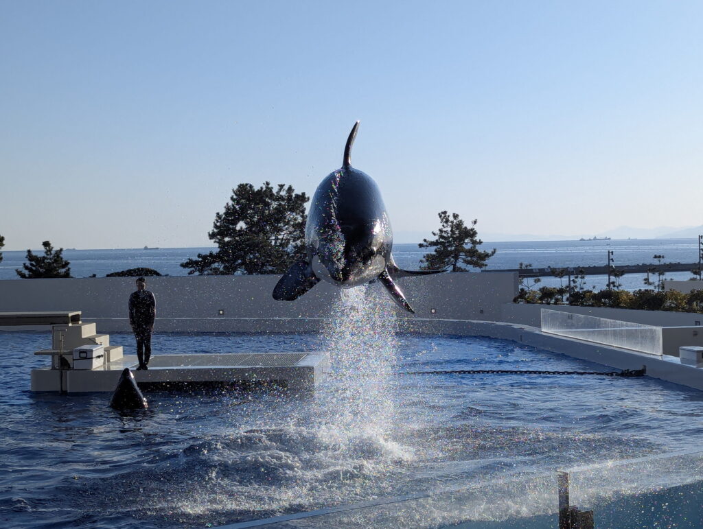このオルカパフォーマンスは、2頭の親子シャチ「ステラ(母)」「ラン(娘)」が空中にジャンプしたり、観客に派手に水をぶっかけたり、トレーナーと一緒に泳いだりと息の合った演技を行います。