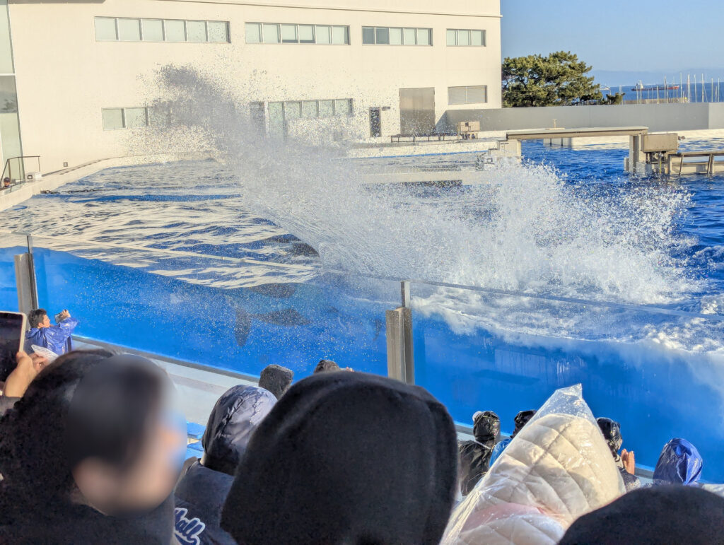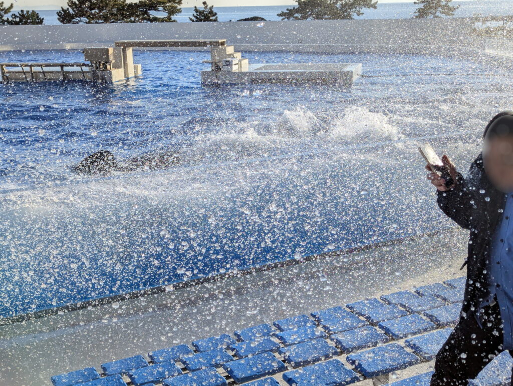 そして神戸須磨シーワールドのオルカパフォーマンスの見どころ(体験どころ?)の尻尾で観客に水をぶっかけです。