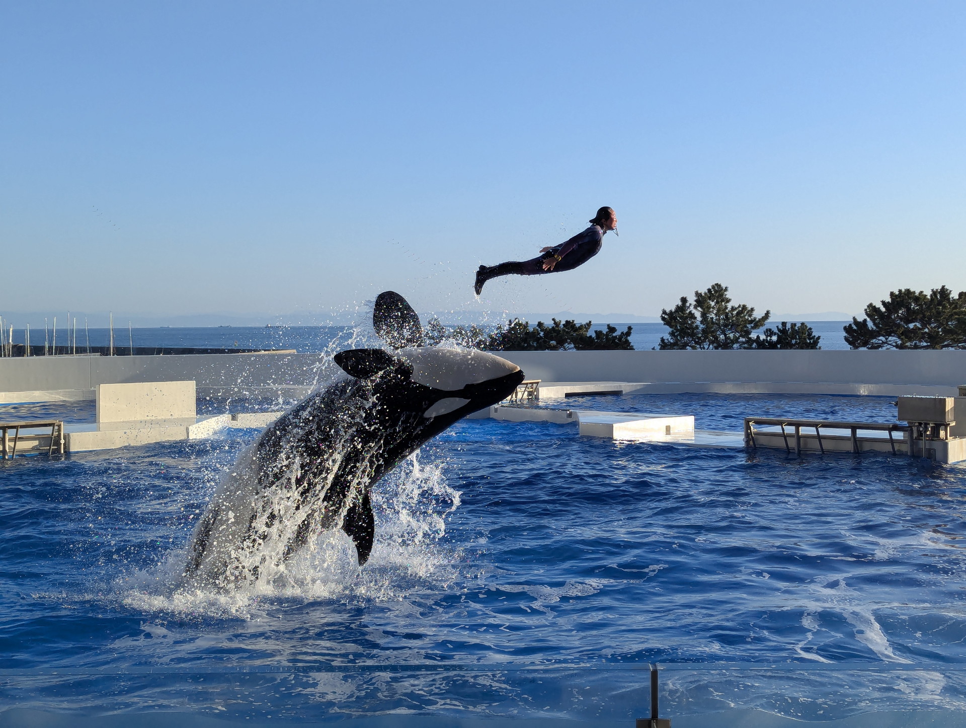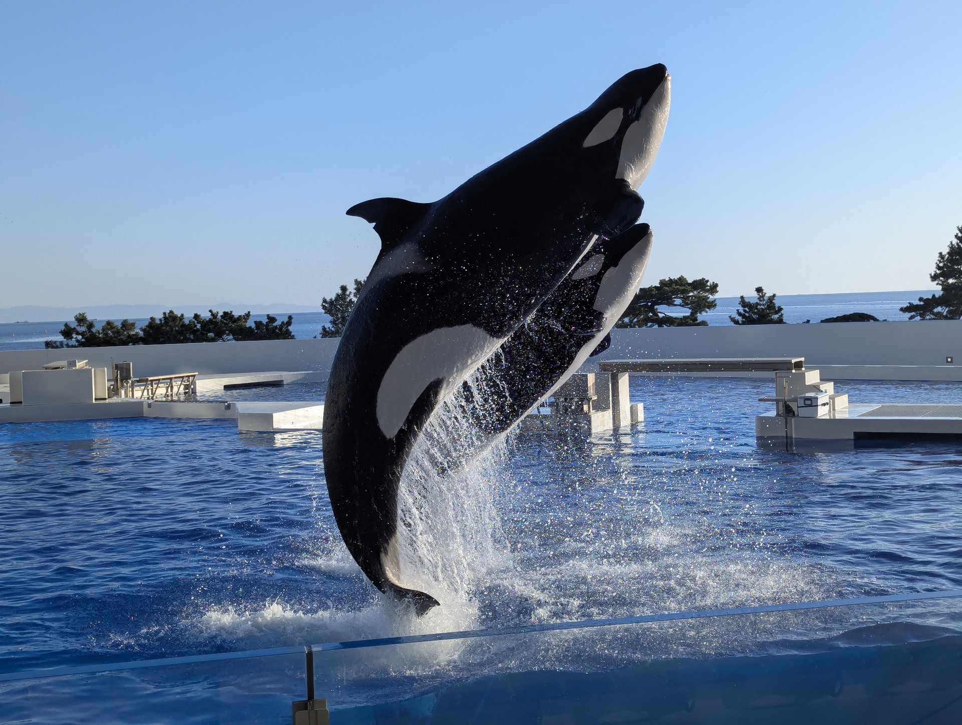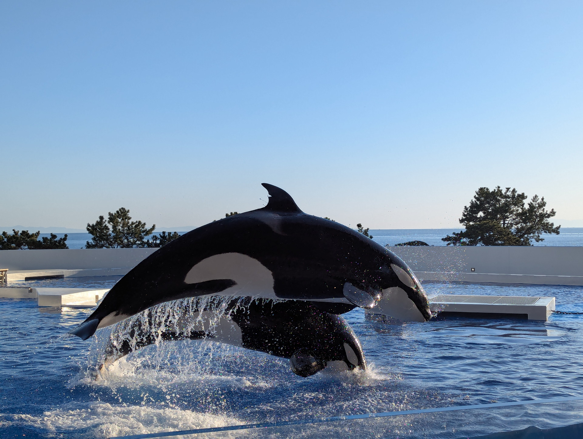 このオルカパフォーマンスは、2頭の親子シャチ「ステラ(母)」「ラン(娘)」が空中にジャンプしたり、観客に派手に水をぶっかけたり、トレーナーと一緒に泳いだりと息の合った演技を行います。
