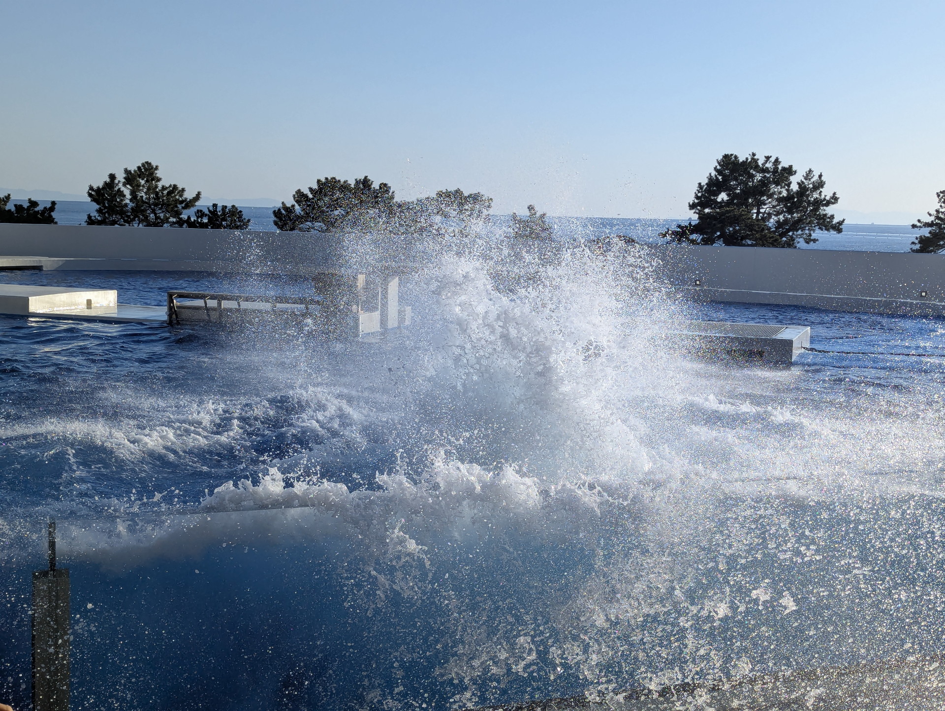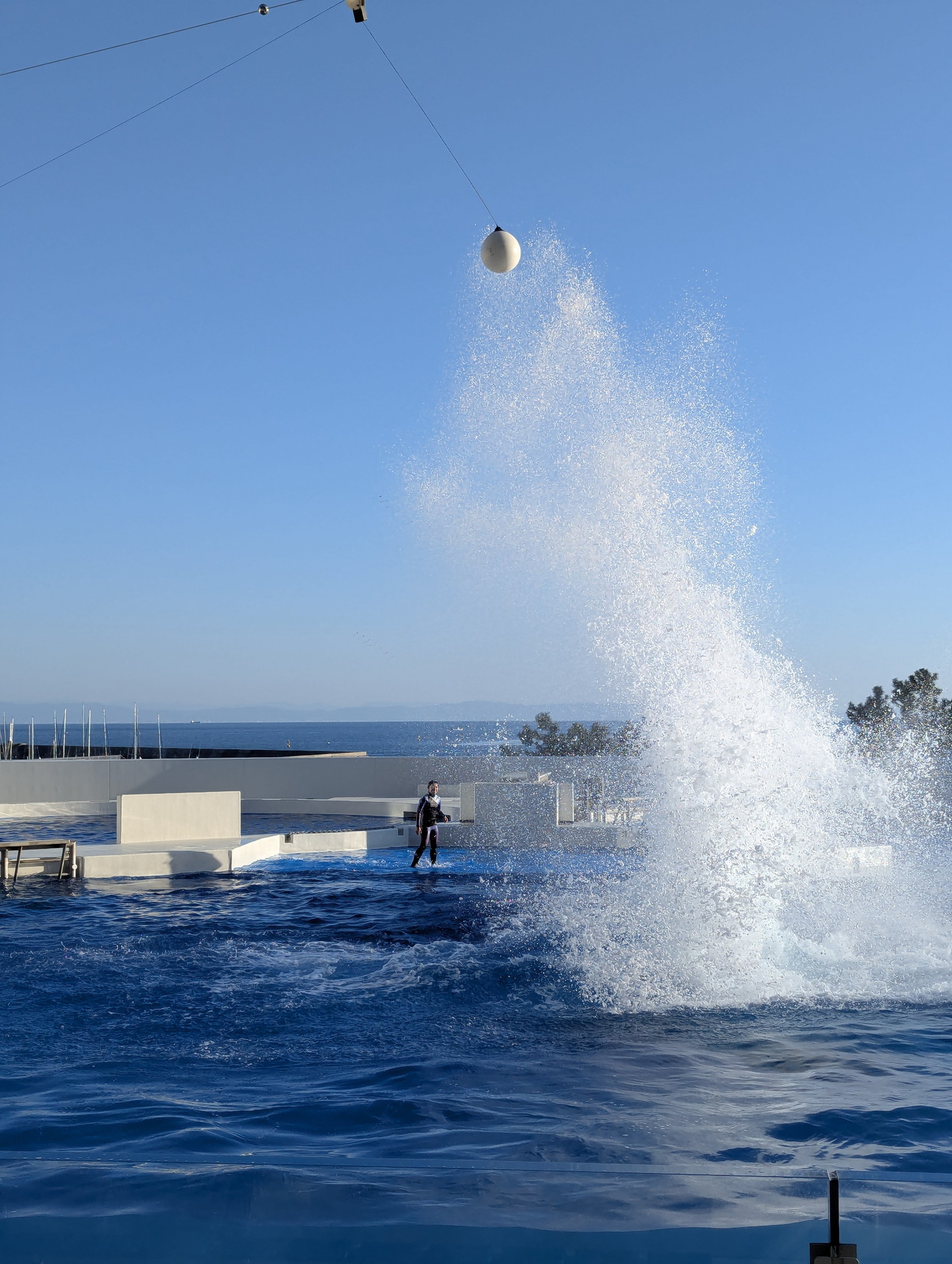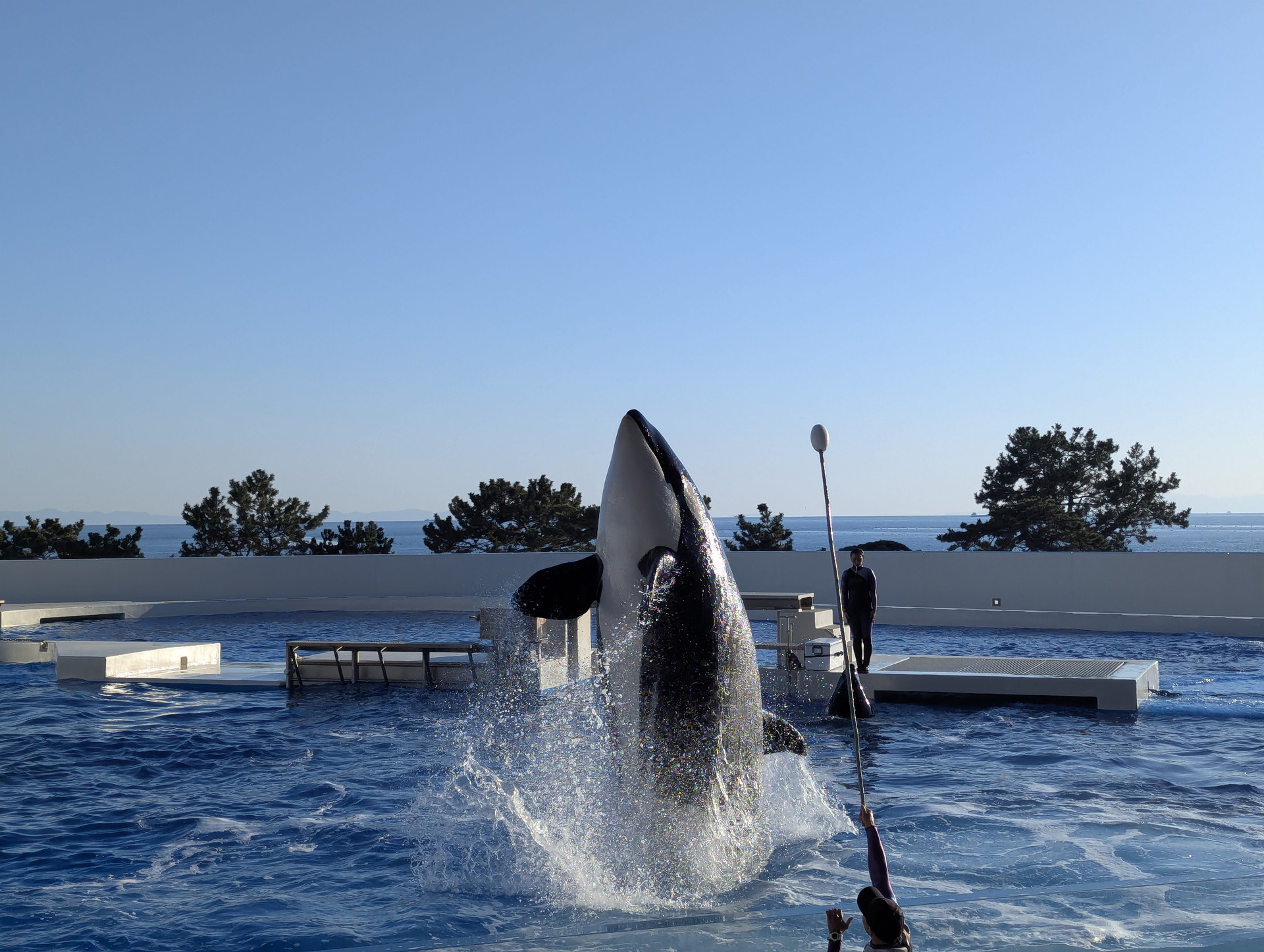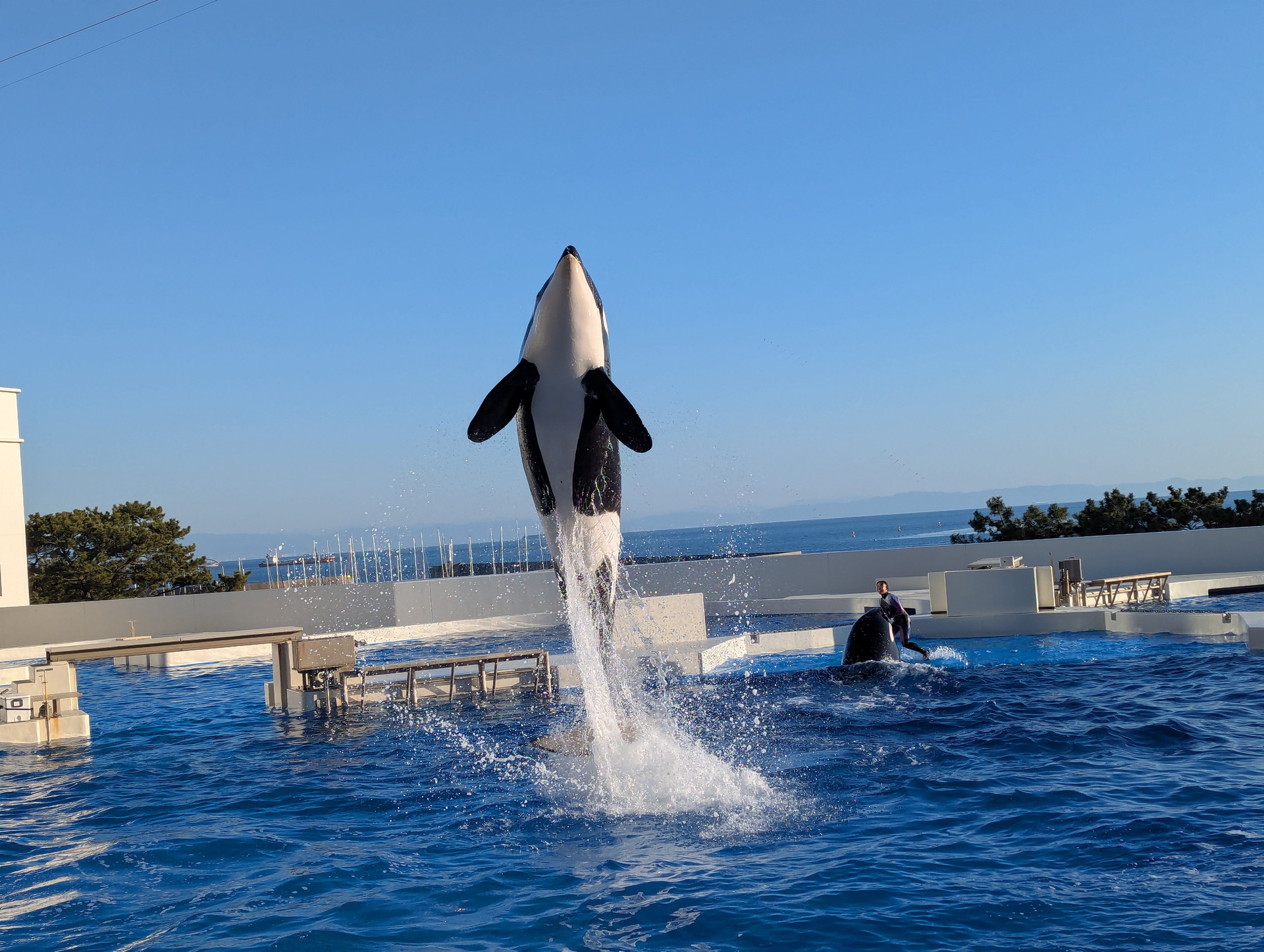 このオルカパフォーマンスは、2頭の親子シャチ「ステラ(母)」「ラン(娘)」が空中にジャンプしたり、観客に派手に水をぶっかけたり、トレーナーと一緒に泳いだりと息の合った演技を行います。