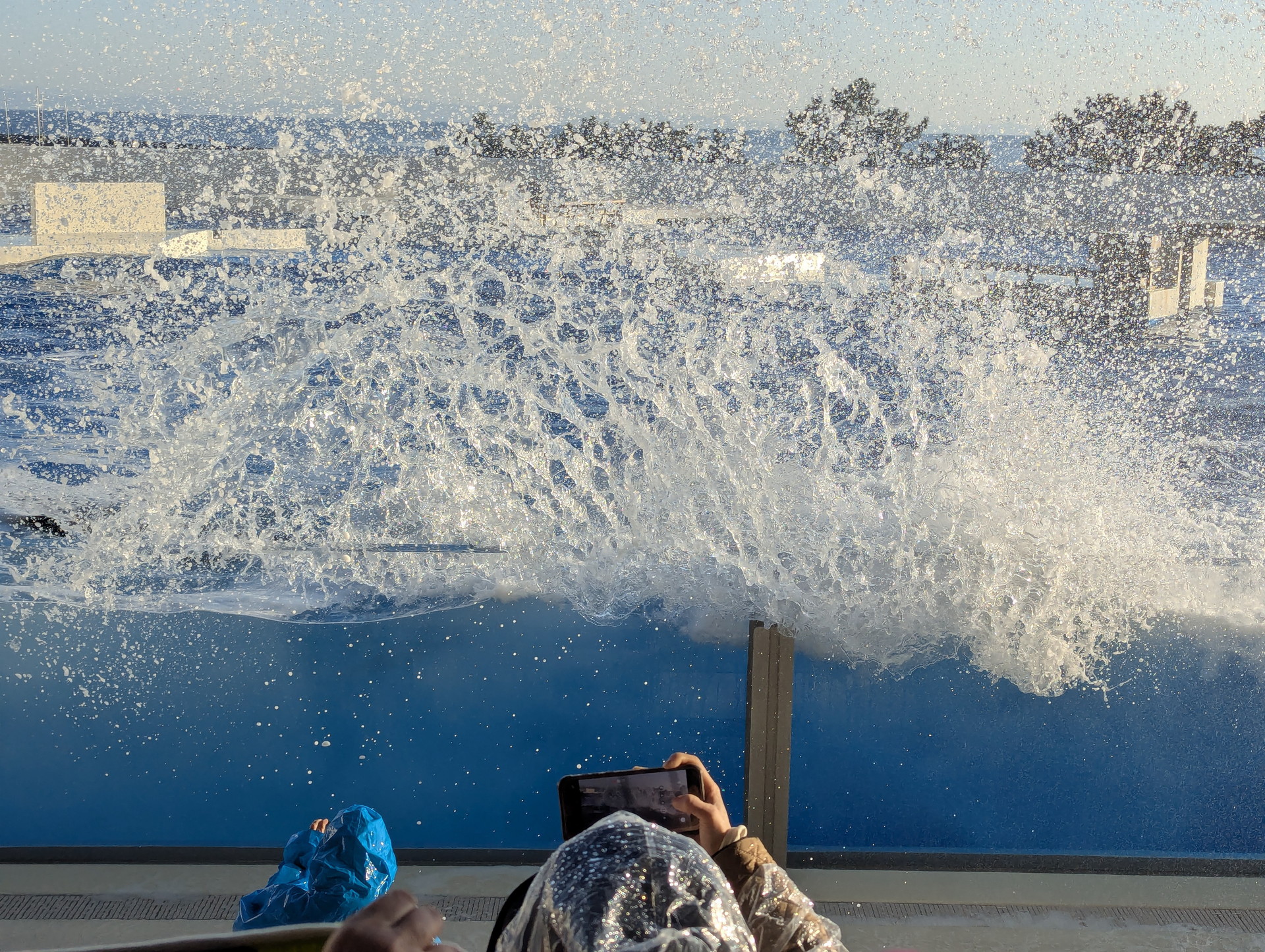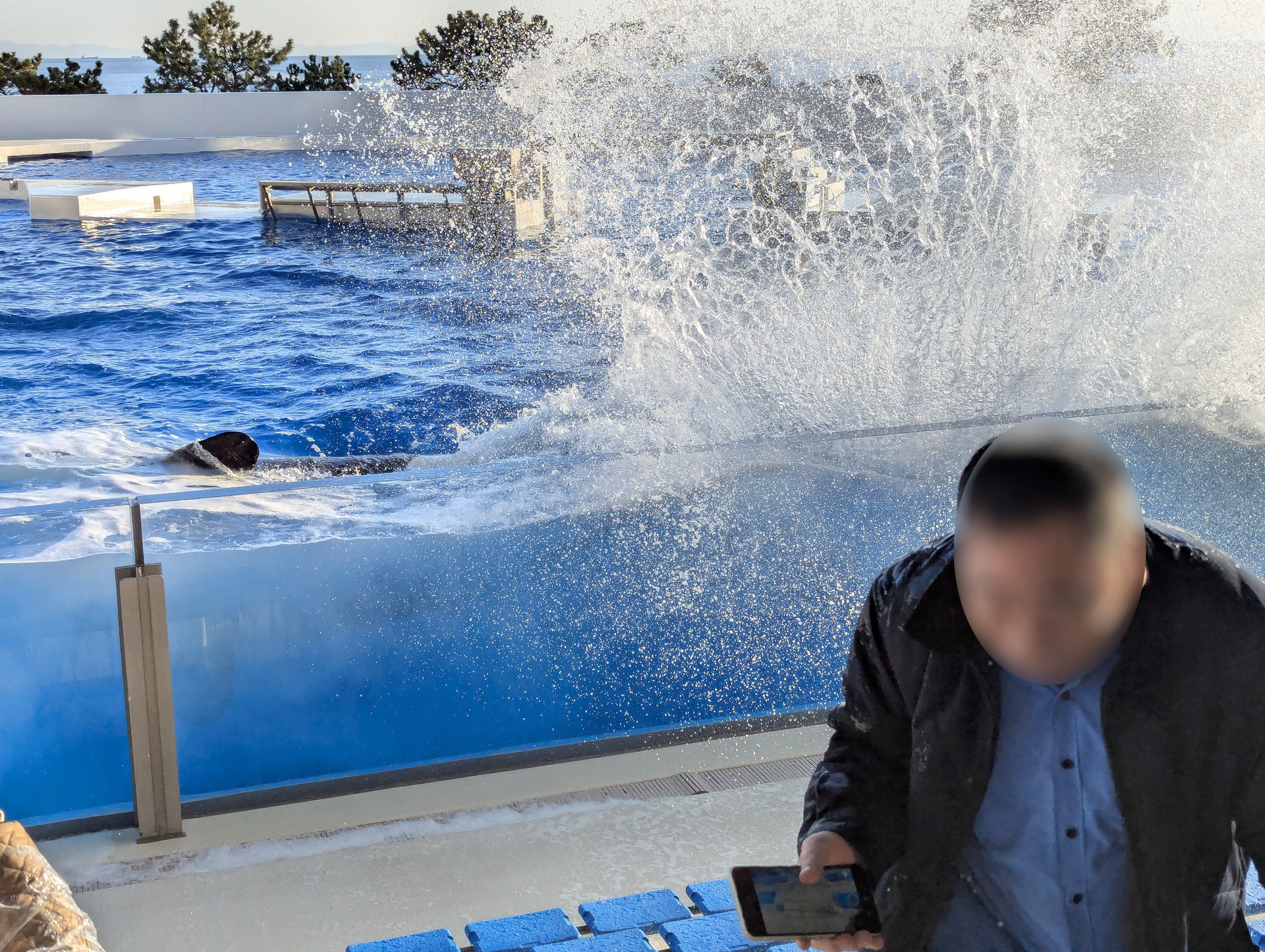そして神戸須磨シーワールドのオルカパフォーマンスの見どころ(体験どころ?)の尻尾で観客に水をぶっかけです。