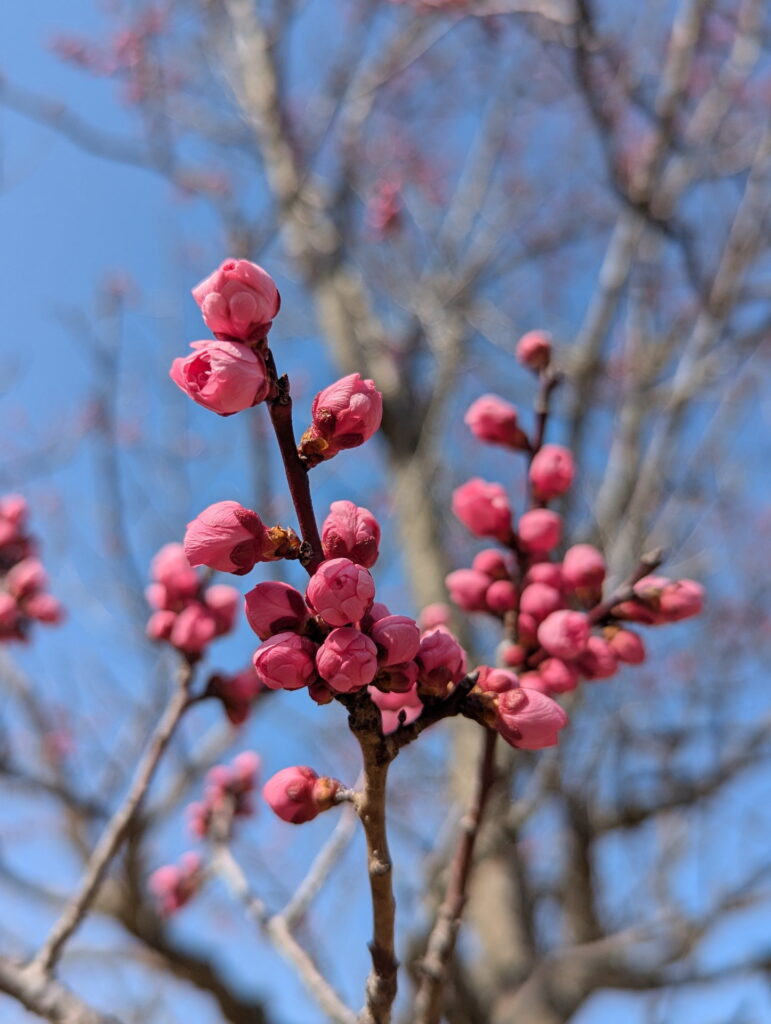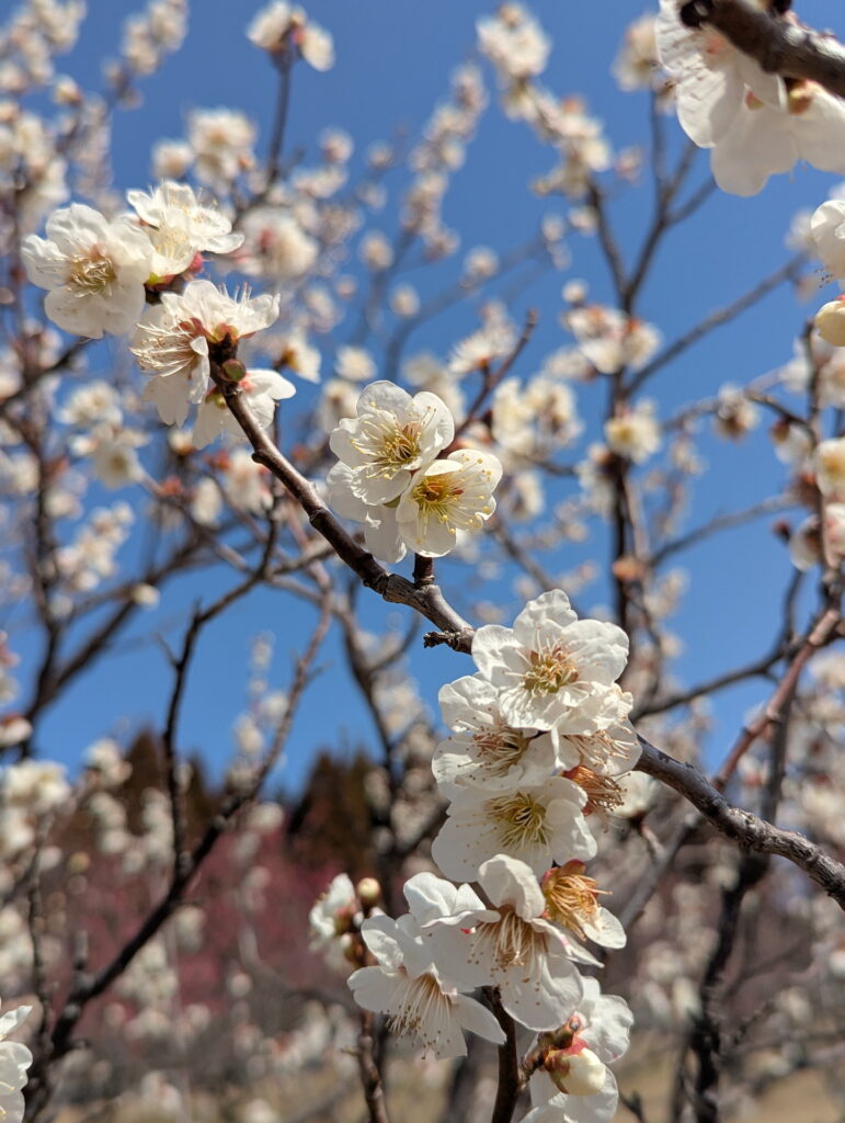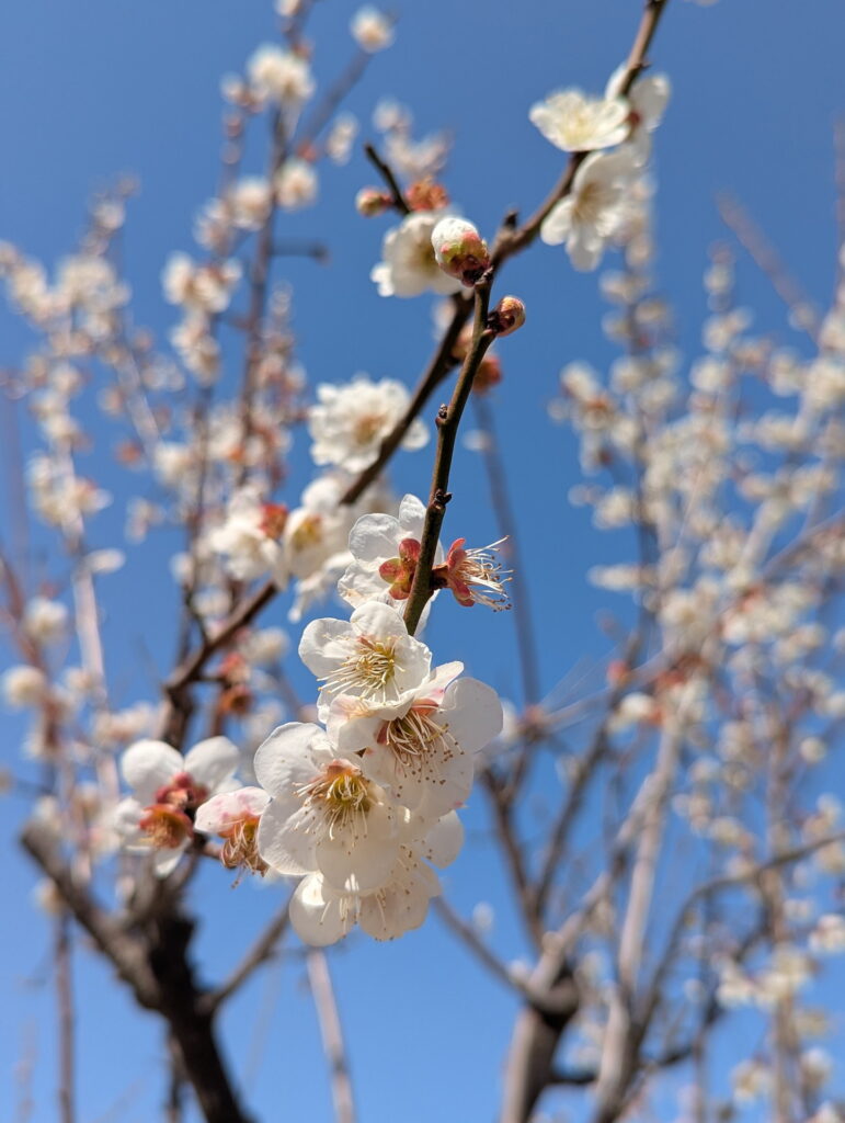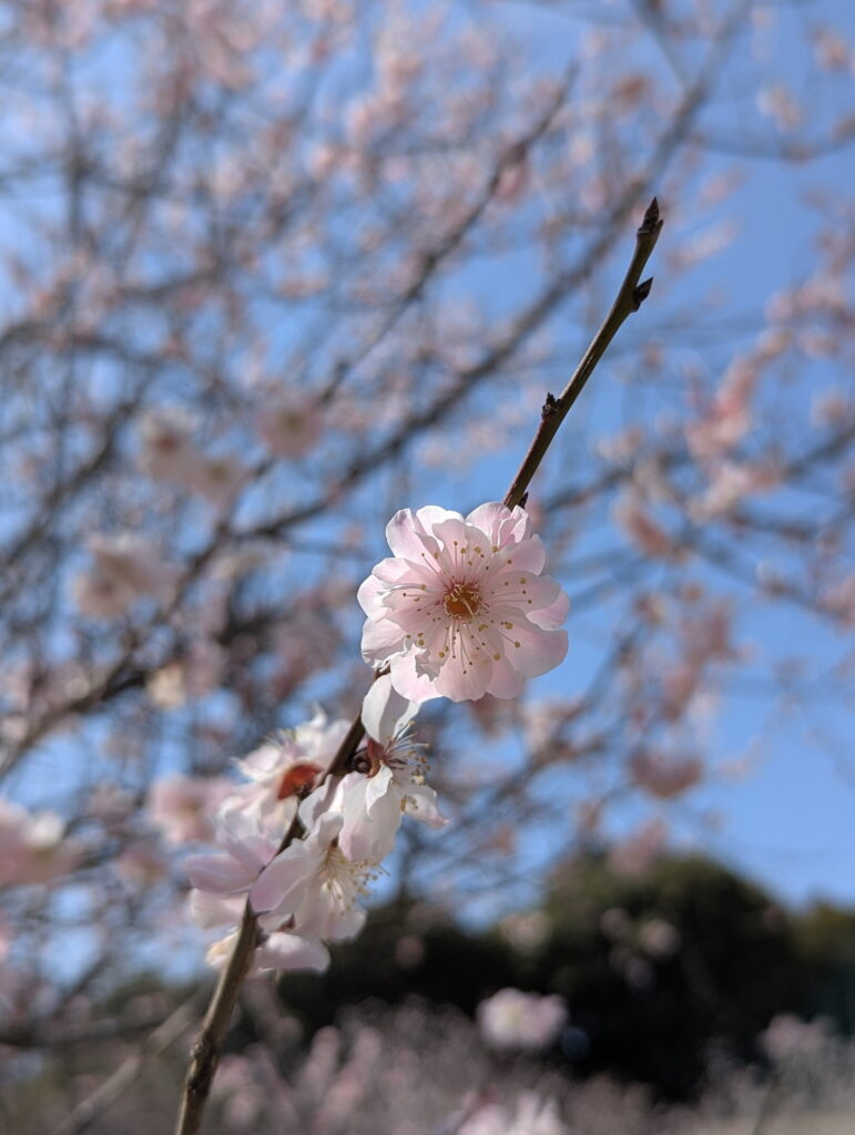 梅はほぼ満開だったのですが、桜みたいにぎっしりと詰まって咲くわけではないので近づいてみないと美しさがよくわからないですね。