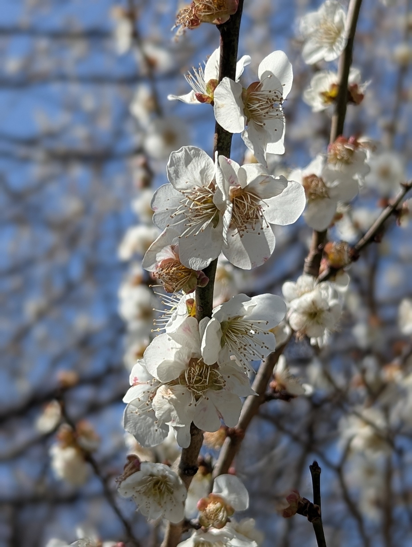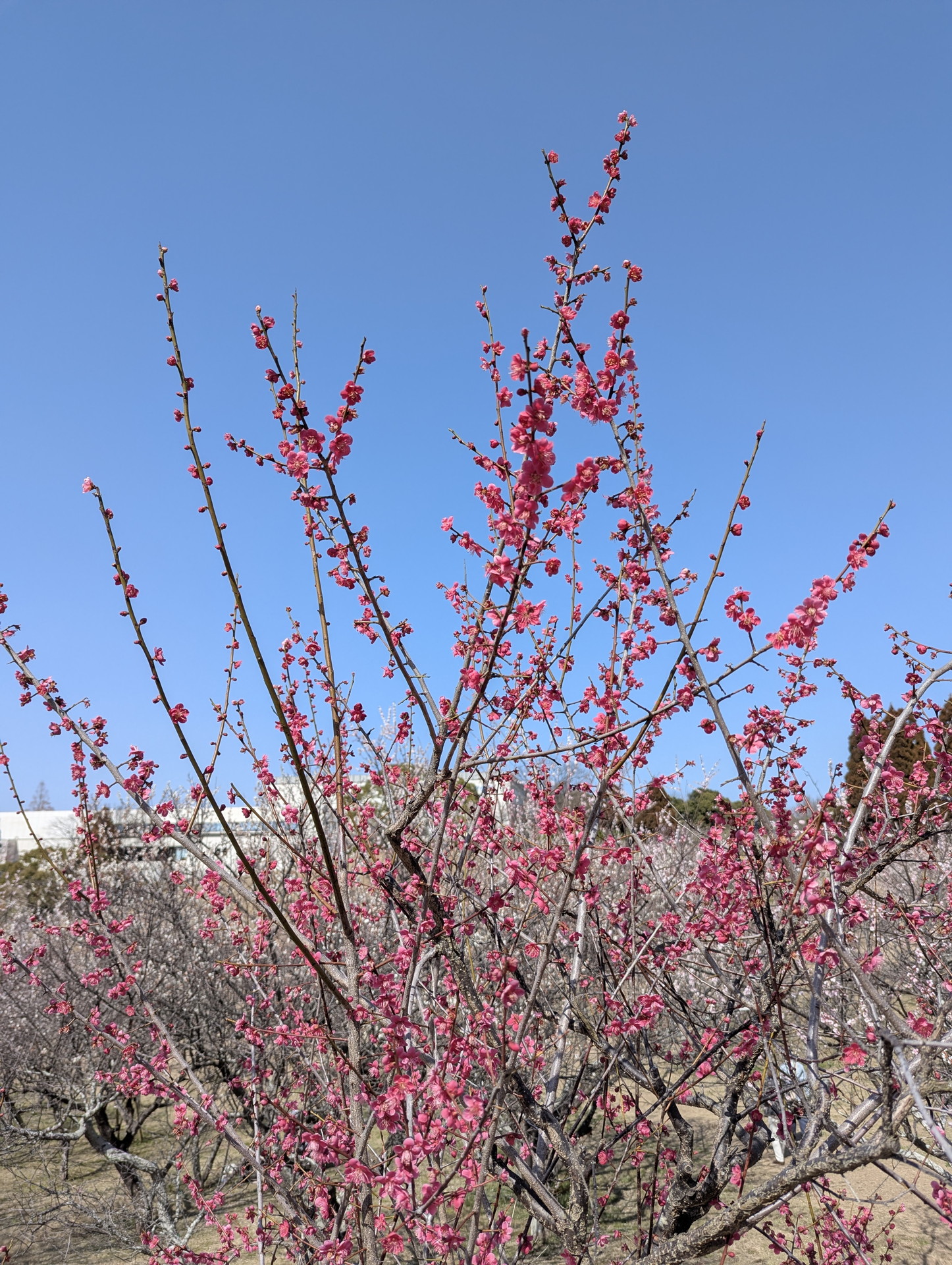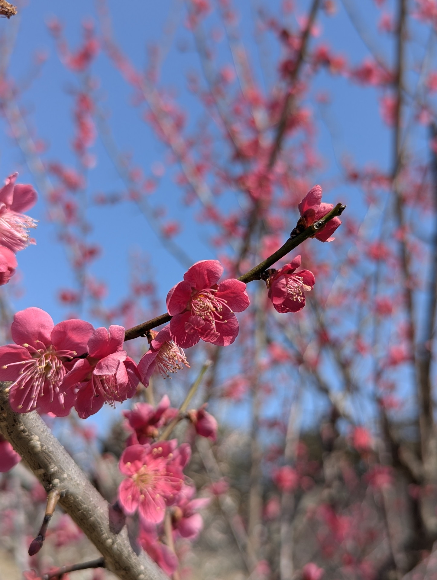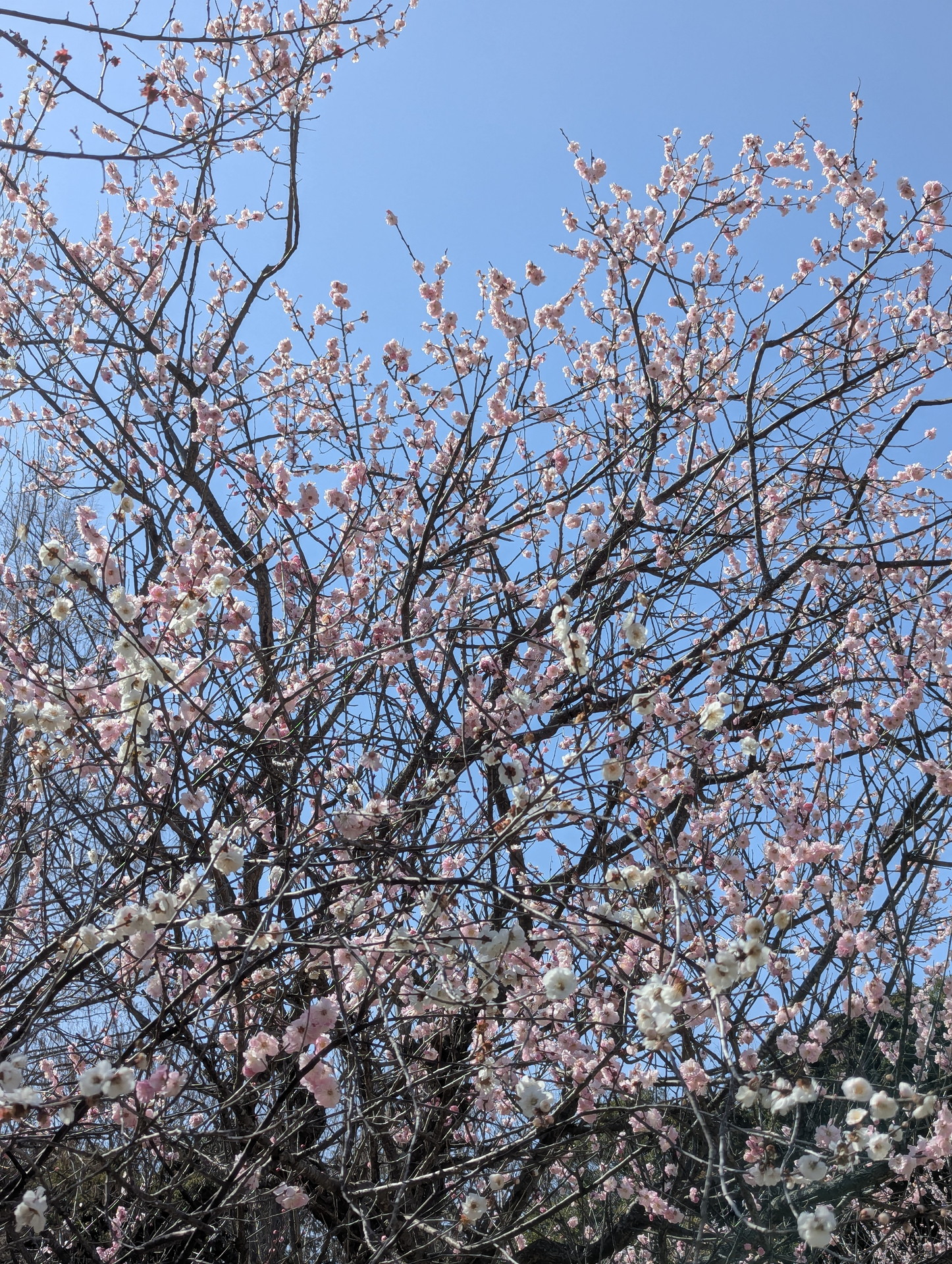 梅はほぼ満開だったのですが、桜みたいにぎっしりと詰まって咲くわけではないので近づいてみないと美しさがよくわからないですね。