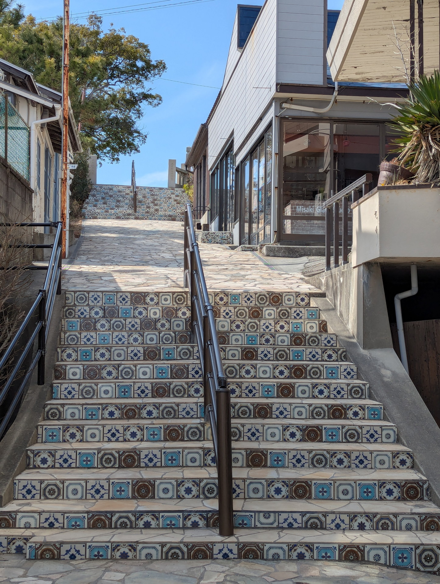坂を下って振り返ってみると。階段には色とりどりのタイルが貼り付けられていました。